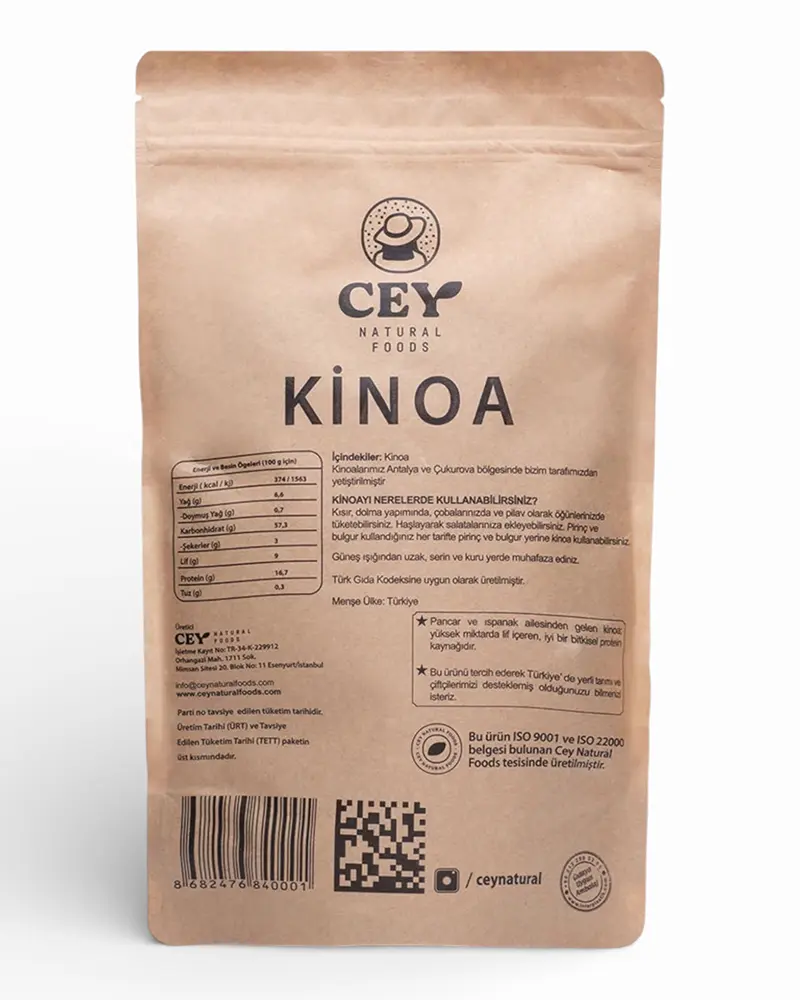Yüksek besin değeri ve doğal glutensiz yapısıyla mutfağın en pratik ve besleyici tahıllarından biri olan kinoa, yerli üretimdir. Bitkisel protein ve lif içeriğiyle öğünlerinize çeşitlilik katar; dengeli beslenme rutininizi desteklemeye yardımcı olur. Vegan ve vejetaryen beslenmede, sporcu öğünlerinde ve sağlıklı tariflerde güvenle tercih edebileceğiniz çok yönlü bir alternatiftir.