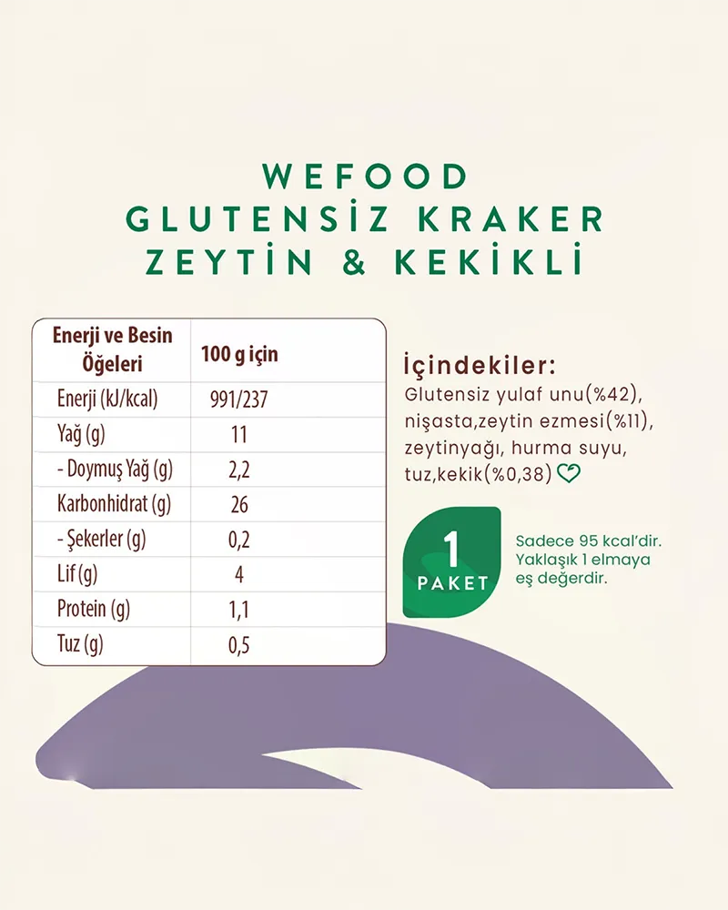 Wefood Glutensiz Zeytinli Kekikli Kraker, yulaf unundan gelen lif ve zeytinden gelen doğal yağlarla doyurucu bir lezzet sunar. Ayrıca içerdiği bitkisel bileşenler sayesinde pratik bir ara öğün alternatifi oluşturur. Katkısız içeriği ve hafif yapısı, gün boyu dengeli bir beslenmeyi destekler. Böylece hem lezzetli hem de sade bir atıştırmalık deneyimi yaşarsınız.